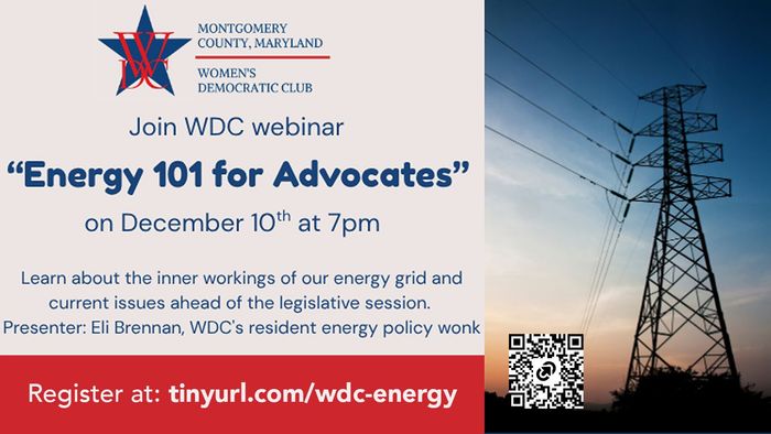 Eli Brennan, WDC's resident energy policy wonk, will present a guide to Maryland's utilities and their regulation, current energy policy topics in the State, and how advocates can address common misconceptions about renewable energy during the session.