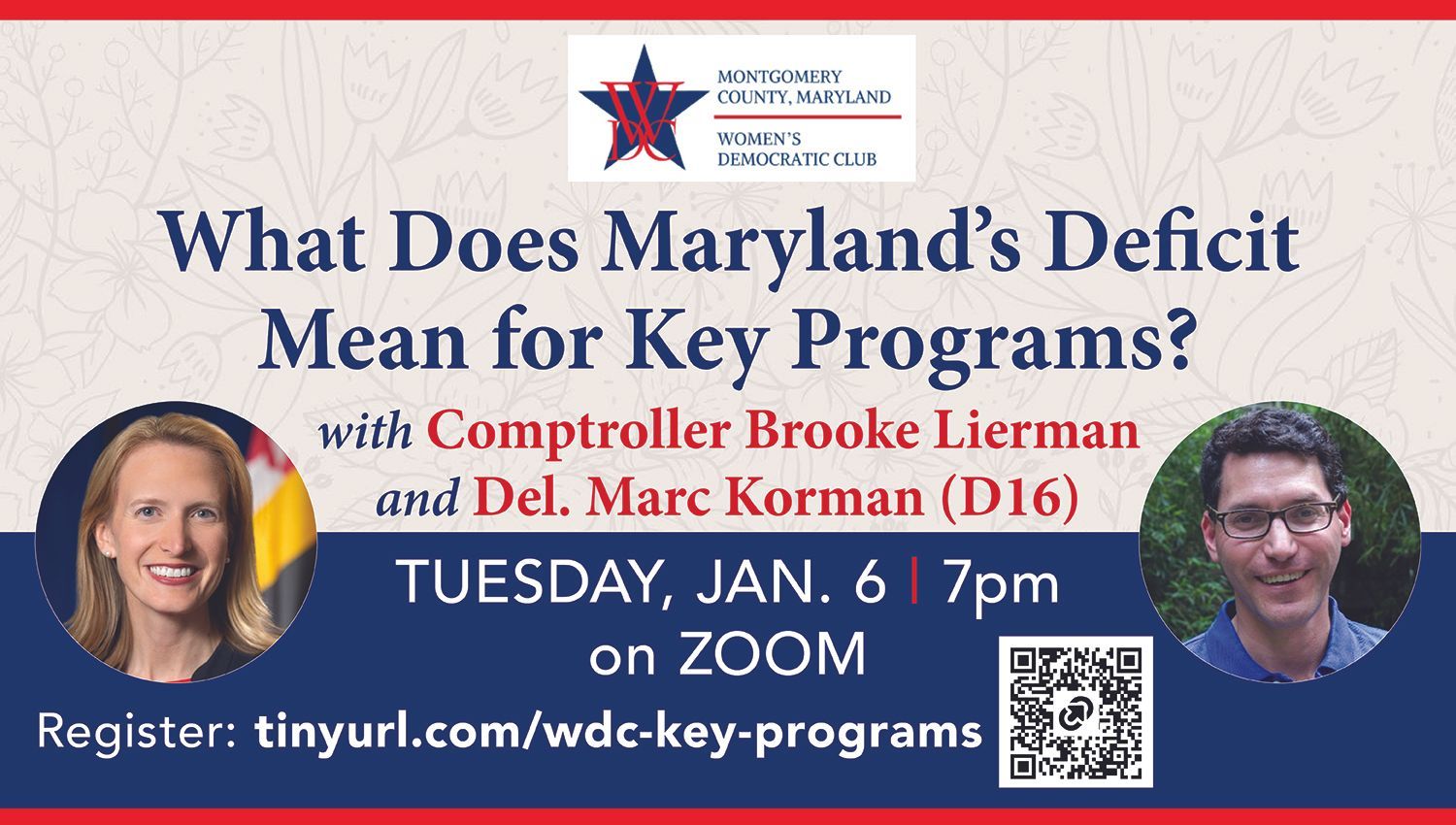 WDC has asked Comptroller Lierman to give some hard facts about the State’s fiscal condition and what she sees as the possibilities for expanding our revenue base. And, we have asked Del. Marc Korman (D16) to give us a sense of what lies ahead in navigating a budget that can reasonably address projected deficits while preserving spending priorities.