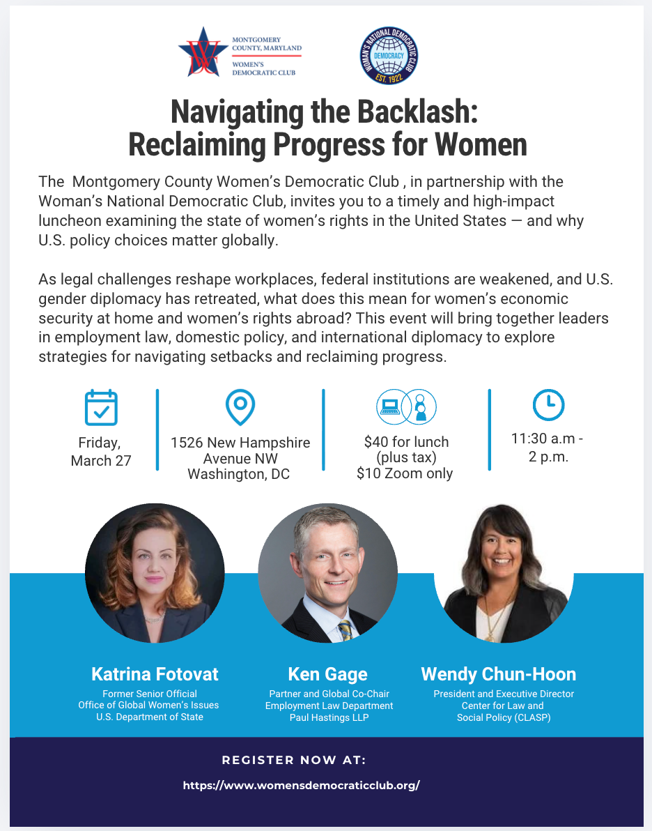 Join us for lunch at the beautiful home of the Women's National Democratic Club to hear from experts strategizing about setbacks and progress for women.